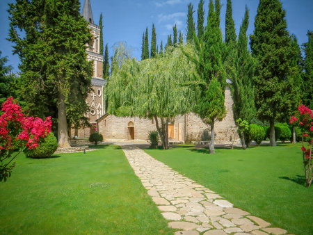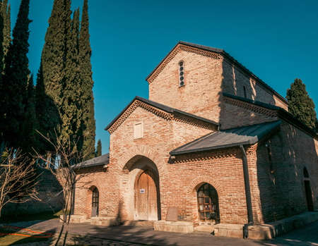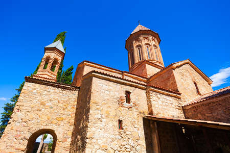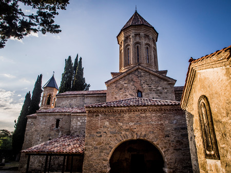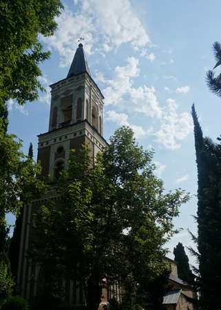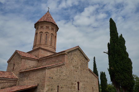 Ikalto orthodox monastery against blue sky and cypress trees, Georgia