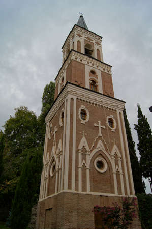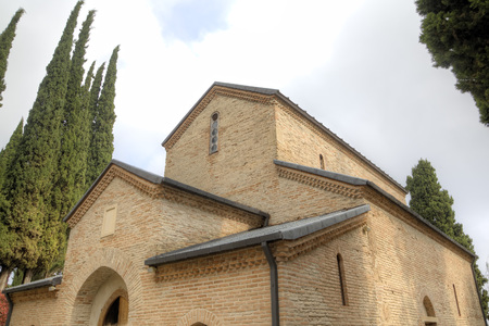 old restored temple of David the Builder Kutaisi 2014. before the temple there is a stone fence and high conifer