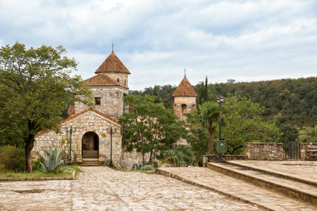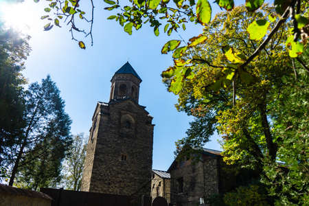 Bodbe, Georgia - September 24, 2023: countryard of Bodbe Monastery in Kakheti region of Georgia on sunny autumn day