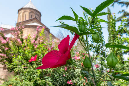 Close up view on pink hibiscus with the Metekhi Church above the Kura river in city center of Tbilisi, Georgia. Georgian architecture sightseeing centre. Old town. Ancient church. Flower and bloom.
