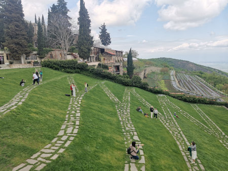 Terraced green hillside with stone paths and cypress trees
