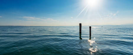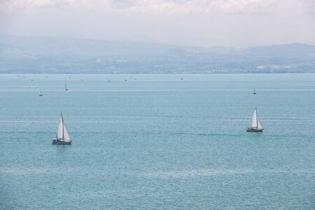 Lake Garda (Lago di Garda) view from the small port of Lazise village, tourist resort on the coast, Verona province, Italy, southern Europe. In the background the coast of Lombardy.