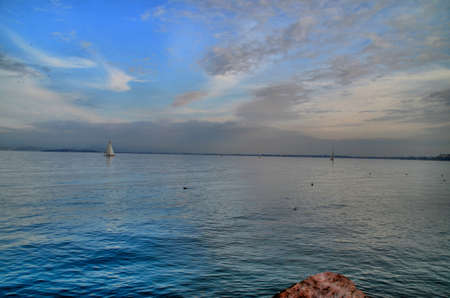 A view over Lake Garda in Veneto, Italy, taken from the shore at the town of Garda