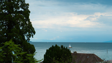 A small sailing ship from the beach promenade in Meersburg on Lake Constance photographed.