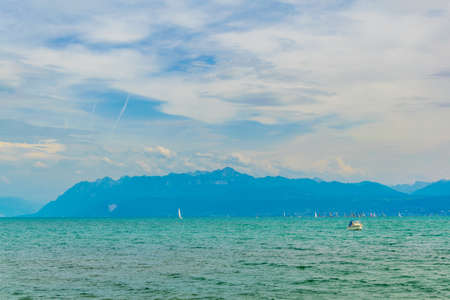 Evening view from the top of the French town Bons-en-Chablais, lake Geneva (lake Leman) and the mountains in Switzerland. Division of Haute-Savoie, region of Auvergne-Rhone-Alpes in France.