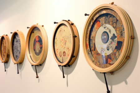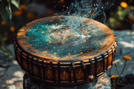 A shaman drum with intricate designs used in spiritual rituals to connect with the spirit world. Concept Spiritual Rituals, Shaman Drum, Intricate Designs, Connection with Spirit World