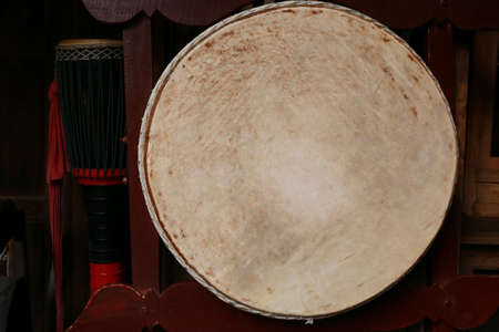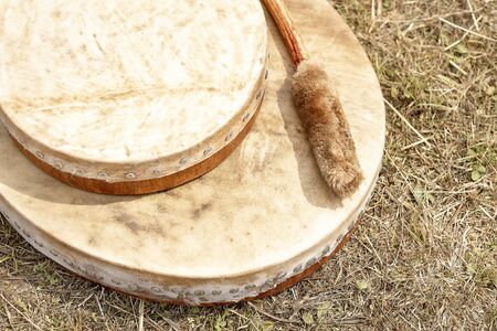 Shaman's tambourine made of genuine leather close-up. High quality photo