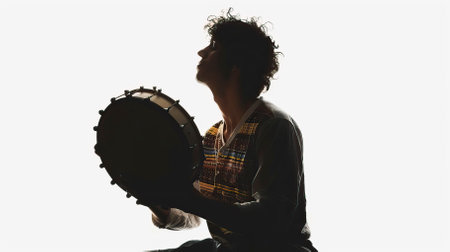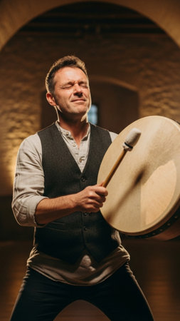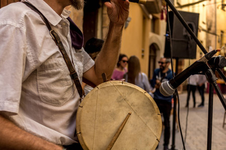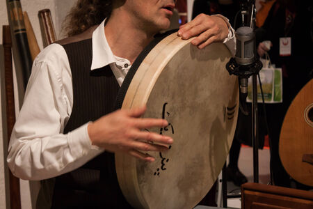 tambourine folk drum musician person male hands play rhythmic music historical festival event with ethnic themes atmosphere
