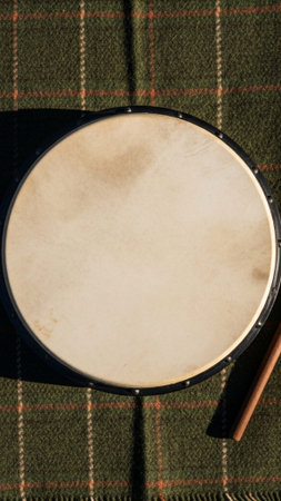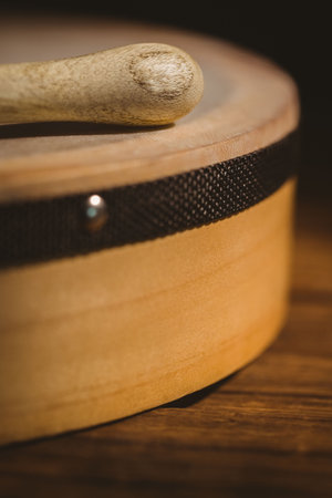 A striking vertical, full-frame composition of a traditional Irish Bodhran (hand drum) and its woode
