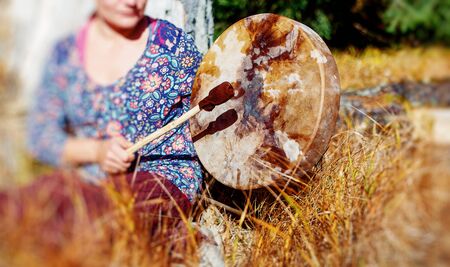 beautiful shamanic girl playing on shaman frame drum in the nature.
