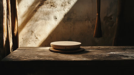 A minimalist arrangement of rustic pottery and wooden textures under soft natural light, creating a serene atmosphere.