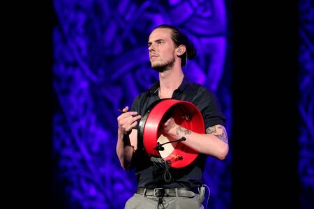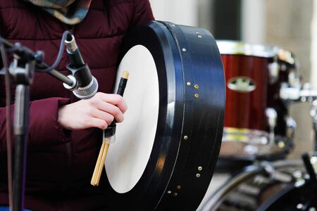 A performance by a talented bodhran player their hands moving quickly and skillfully over the drum adding a rhythmic beat to the live music