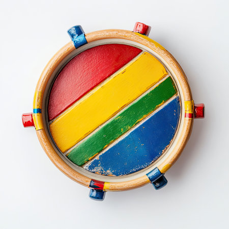 photo of a musical baby drum with bright colors, top-down view, isolated on white background, professional photography --ar 1:1 --v 6.1 Job ID: 9f0c1b3b-0324-4773-b909-64c49828c3e2
