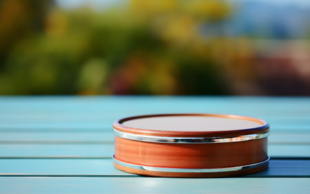 Vibrant tambourine lies on a rustic wooden table, surrounded by colorful fabric, creating a lively and artistic atmosphere