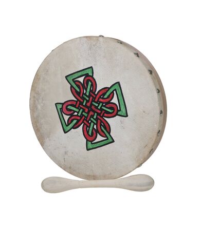 A handcarved traditional Irish bodhrán drum sits on a shelf adorned with colorful Celtic patterns