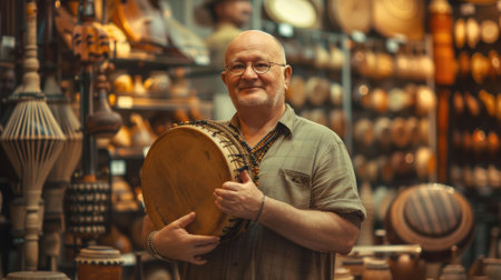 The picture of the ethnomusicologist holding the traditional guitar inside workshop that has been filled with musical instrument, ethnomusicologist require knowledge of world music and culture. AIG43.