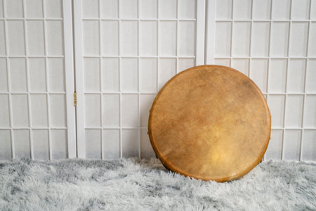 Tambourine sound therapy. Rhythm instrument. Tool for calming spiritual meditation wellness retreat for healing relaxing treatment.