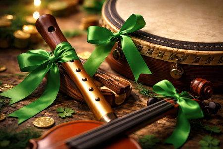 Irish folk instruments adorned with green ribbons and shamrocks. St. Patricks Day musical setup featuring flute, bodhran, violin, gold coins, and candles on rustic wood.