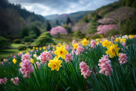 A stunning spring landscape features a close-up of vibrant yellow daffodils and pink hyacinths blooming in a lush, rolling botanical garden valley. The colorful display evokes feelings of natural beauty, growth, and the peaceful joy of springtime.