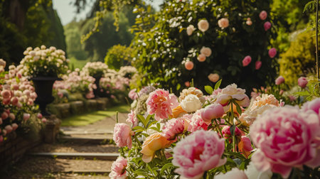Enchanting garden vista featuring colorful roses amidst lush greenery and stone pathway.