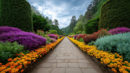 Experience a serene garden pathway lined with vibrant blooms, offering a tranquil escape in nature. Enjoy the beauty and color of this lush landscape under a dramatic sky.