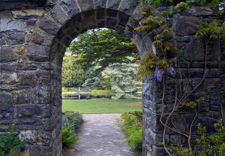 A hidden stone arched gate is opening up to a beautiful English style garden and pond