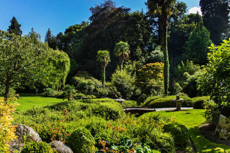 Beautiful Japanese gardens in Powerscourt, with small bridge and variety of flowers and trees, Wicklow, Ireland