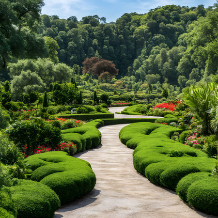 Discover a tranquil garden pathway lined with vibrant flowers and lush greenery, providing a peaceful retreat in a stunning natural landscape.