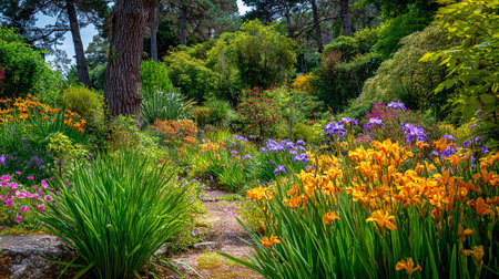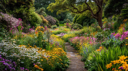 Exquisite colorful garden path through lush greenery, flourishing flowers, and vibrant vegetation