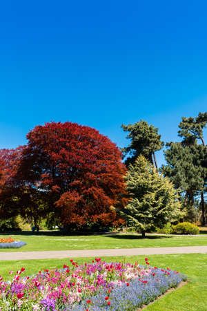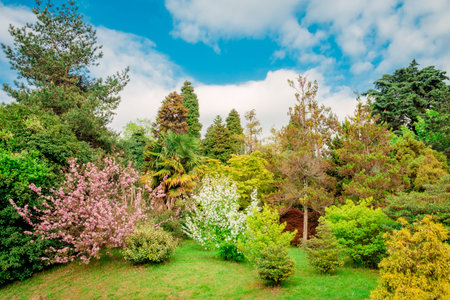 Beautiful Garden with blooming trees during spring time, Wales, UK