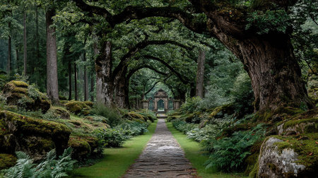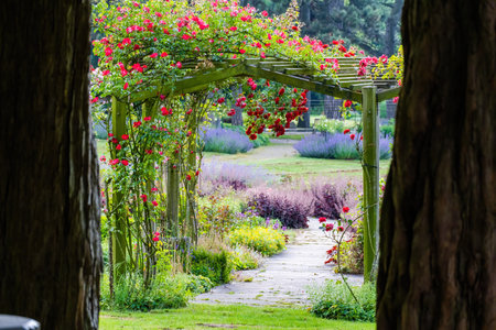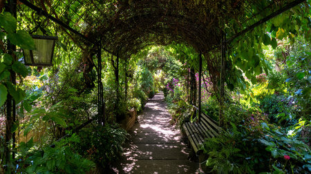 A picturesque garden path invites visitors through lush greenery and vibrant blooms, leading to an enchanting archway nestled in nature's serenity.