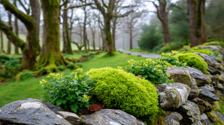 Lush green moss and plants covering a traditional stone wall in a tranquil forest landscape