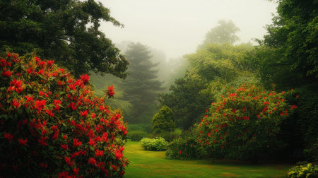 Experience a tranquil garden scene featuring vibrant red flowers surrounded by lush greenery and soft mist, creating a serene and peaceful atmosphere.