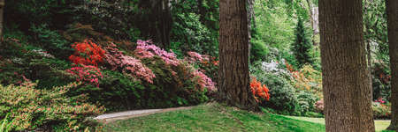 Narrow path through a kaleidoscope of flowering shrubs and trees in a park at springtime.