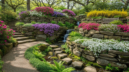 Natural showing lush terraced garden with stone walls waterfalls winding paths and colorful blooming flowers...