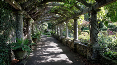 This enchanting garden pathway features lush greenery and stone columns. Sunlight filters through the arches, creating a serene atmosphere perfect for relaxation and reflection.