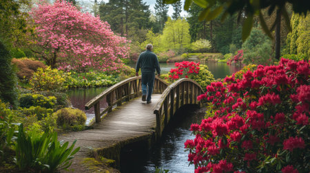 A man strolls leisurely across a wooden bridge in a botanical garden, enjoying the colorful blooming azaleas and rhododendrons that frame the serene waterway and lush greenery.