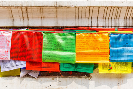 Multicolor prayer buddhist flags fluttering in the wind on the Boudhanath stupa in Kathmandu, Nepal.