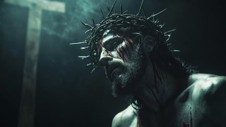 Jesus christ with crown of thorns symbolizing sacrifice for humanity s sins in darkness
