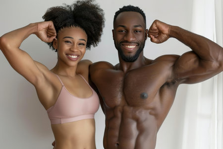 Happy Athletic Black Couple Flexing Their Muscles After Workout, Highlighting Fitness And Wellness