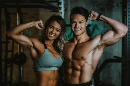 Young athletic couple happily posing and flexing their biceps in a gym setting.