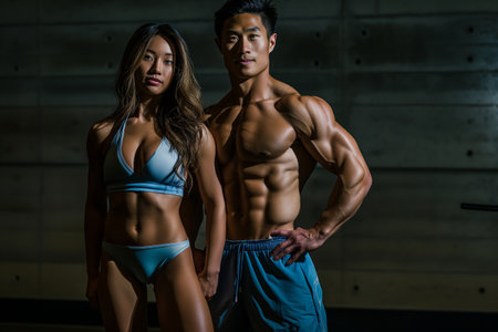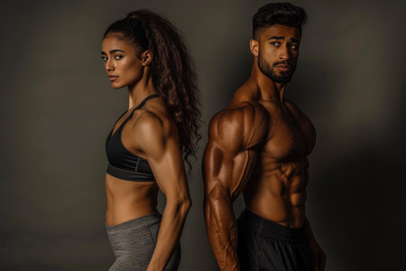 A Muscular men and women showcasing six pack abs in dramatic pose