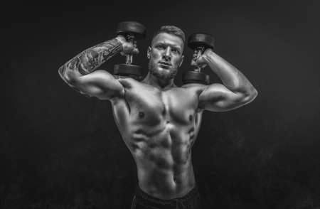 Young muscular guy posing with dumbbells in the studio. Shoulder pumping. Fitness and bodybuilding concept. Mixed media