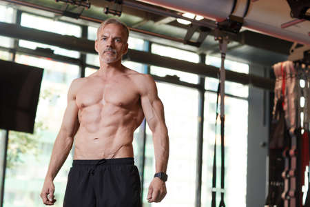 Strong man with fit torso flexing arms muscles standing in double biceps pose in gym, strength