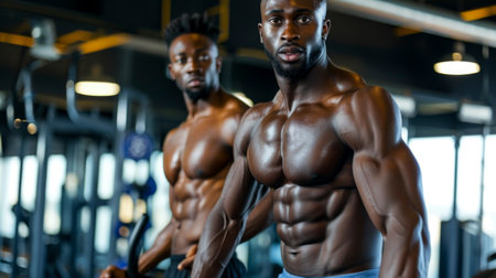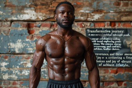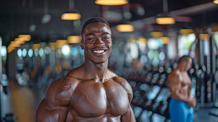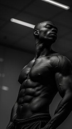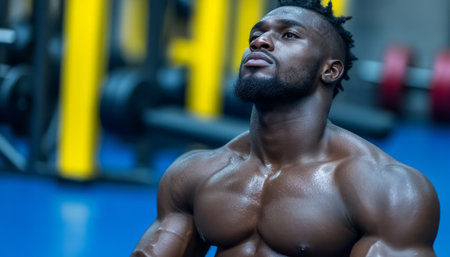 Black man exudes strength and confidence while striking a pose in a gym setting.