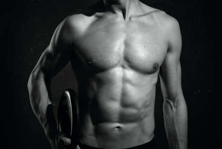 Focus on stomach. Dark contrast shot of young muscular fitness man stomach and arm. Bodybuilder with beads of sweat training in gym. Working out with dumbbells on black background