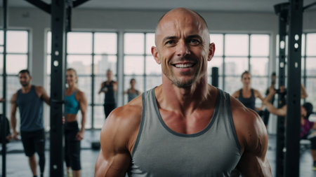 Portrait of strong personal trainer smiling in modern gym with athletes training