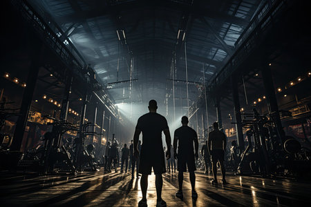 Robust silhouettes in a bodybuilding gym, seeking physical excellence., generative AI