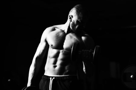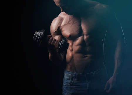 Muscular guy doing exercises with dumbbell. Sporty man working out. Muscular naked male torso. Strength and motivation. Handsome athletic hunk. Strong bodybuilder with perfect power biceps and chest.