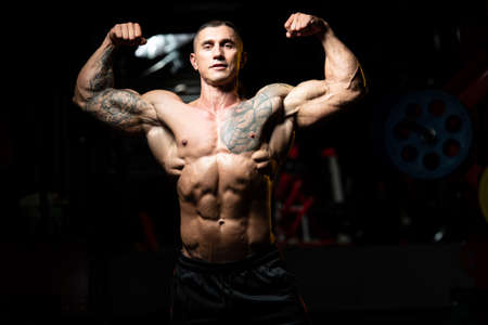 Young Man Standing Strong In The Gym And Flexing Muscles - Muscular Athletic Bodybuilder Fitness Model Posing After Exercises